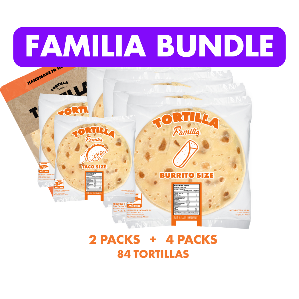 This is the box for the serious tortilla lover. The Familia Bundle Subscription gives you 7 dozen tortillas every month, a mix of 9” Burrito and 6” Taco sizes.
