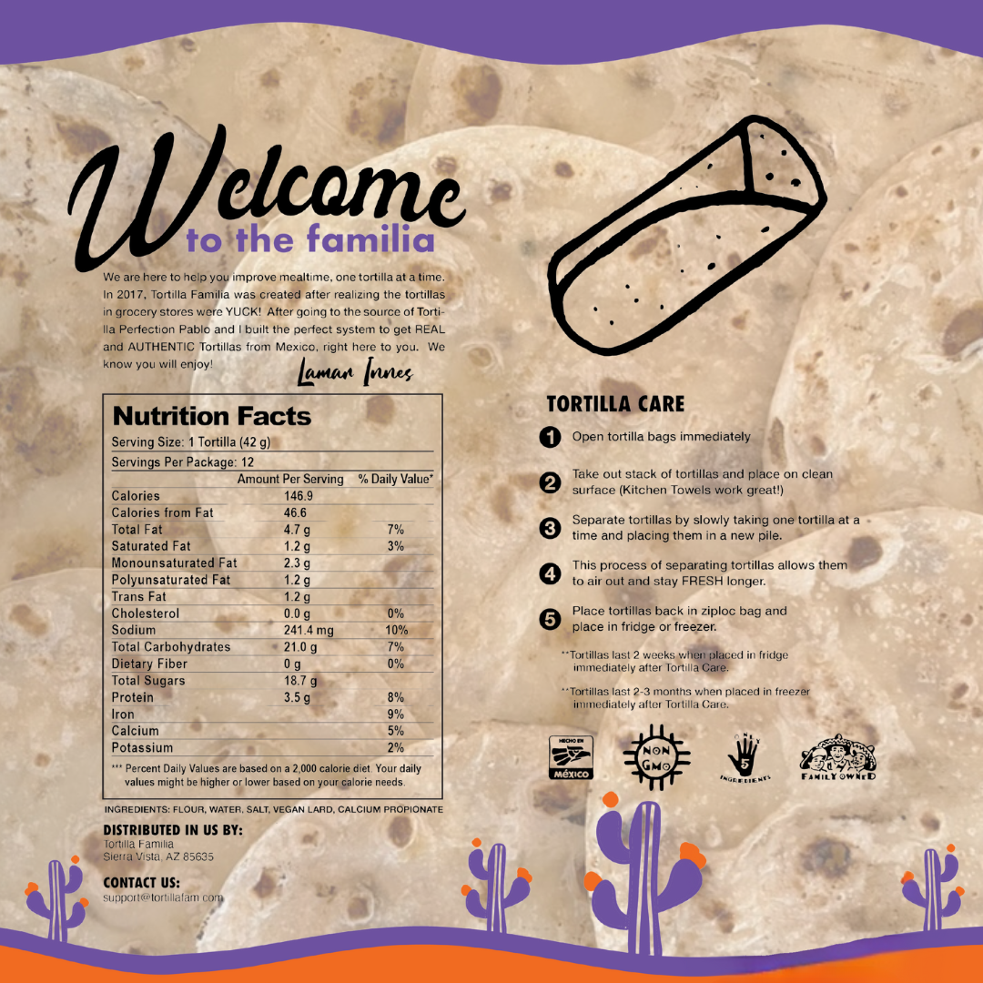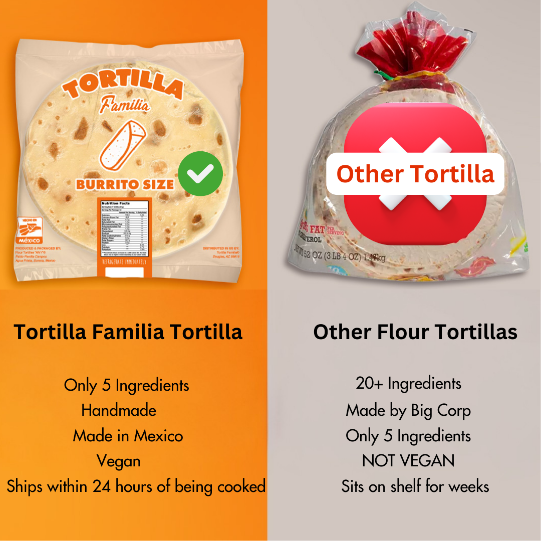 You want to feed your familia nourishing, quality food, and so do we! Dive into a world of flavor with our authentic flour tortillas. Crafted with only 5 simple ingredients to preserve the natural Sonoran style tortilla flavor and quality. Plus, these tortillas are completely VEGAN, so safe to serve to all your amigos.